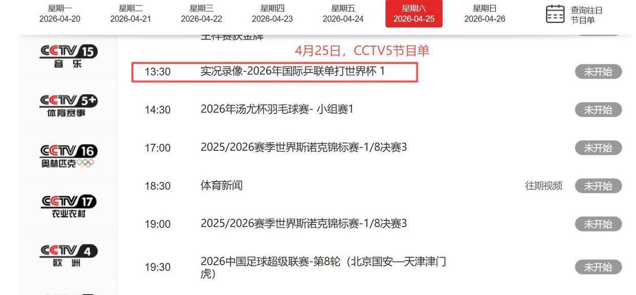 2026-04-26雨燕直播,NBA直播,世界杯直播,足球直播,台球直播,体育直播,世界杯,欧洲杯,苏超直播,村BA直播,苏超联赛,村超,村超直播今天下午1点30分,CCTV5准时播出了“实况录像-2026年国际乒联单打世界杯 1”。 这并非偶然的节目安排。 实际上,从4月20日到26日这一整周,央视的CCTV-5、CCTV-5 和CCTV-16奥林匹克频道都在轮番播出这场世界杯的精彩录像。 今晚,CCTV-16奥林匹克频道在18点10分还会播出世界杯男单比赛的录像。 这种高频率、多平台的集中回顾,被广泛视为为国乒出征世乒赛进行的一次大规模“赛前预热”和“心理动员”。