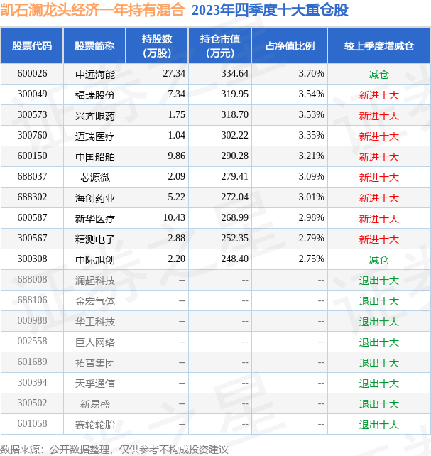 凯石澜龙头经济一年持有混合为混合型-偏股基金,根据最新一期基金季报显示,该基金资产配置:股票占净值比82.25%,无债券类资产,现金占净值比18.15%。基金十大重仓股如下: