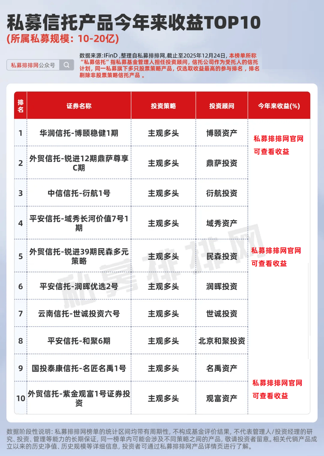 IFinD数据显示,截至12月24日,10-20亿私募管理有业绩显示的股票策略信托产品共79只,今年来收益均值为25.01%。今年来收益位居前三的股票策略信托产品分别来自:博颐资产、鼎萨投资、衍航投资。