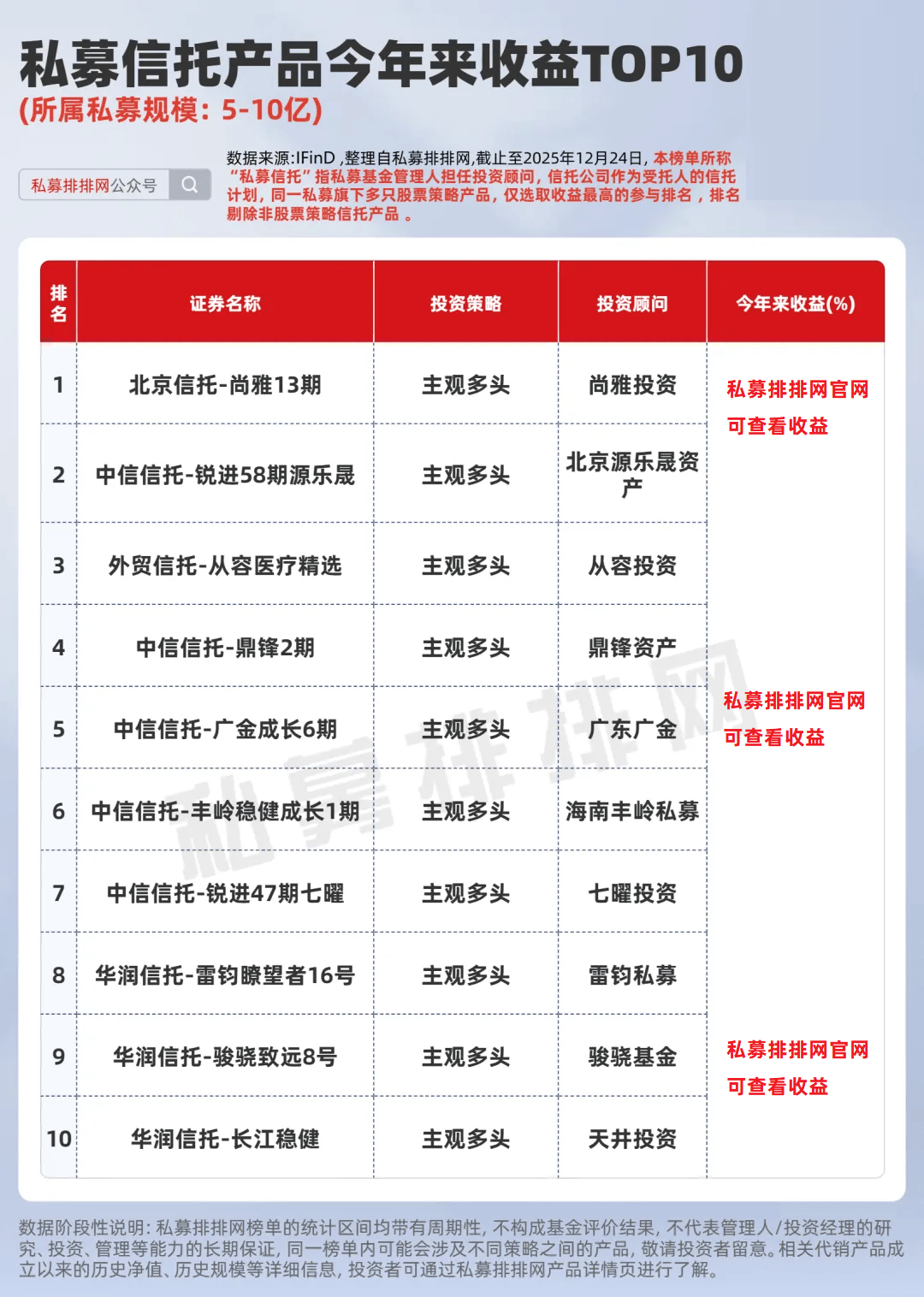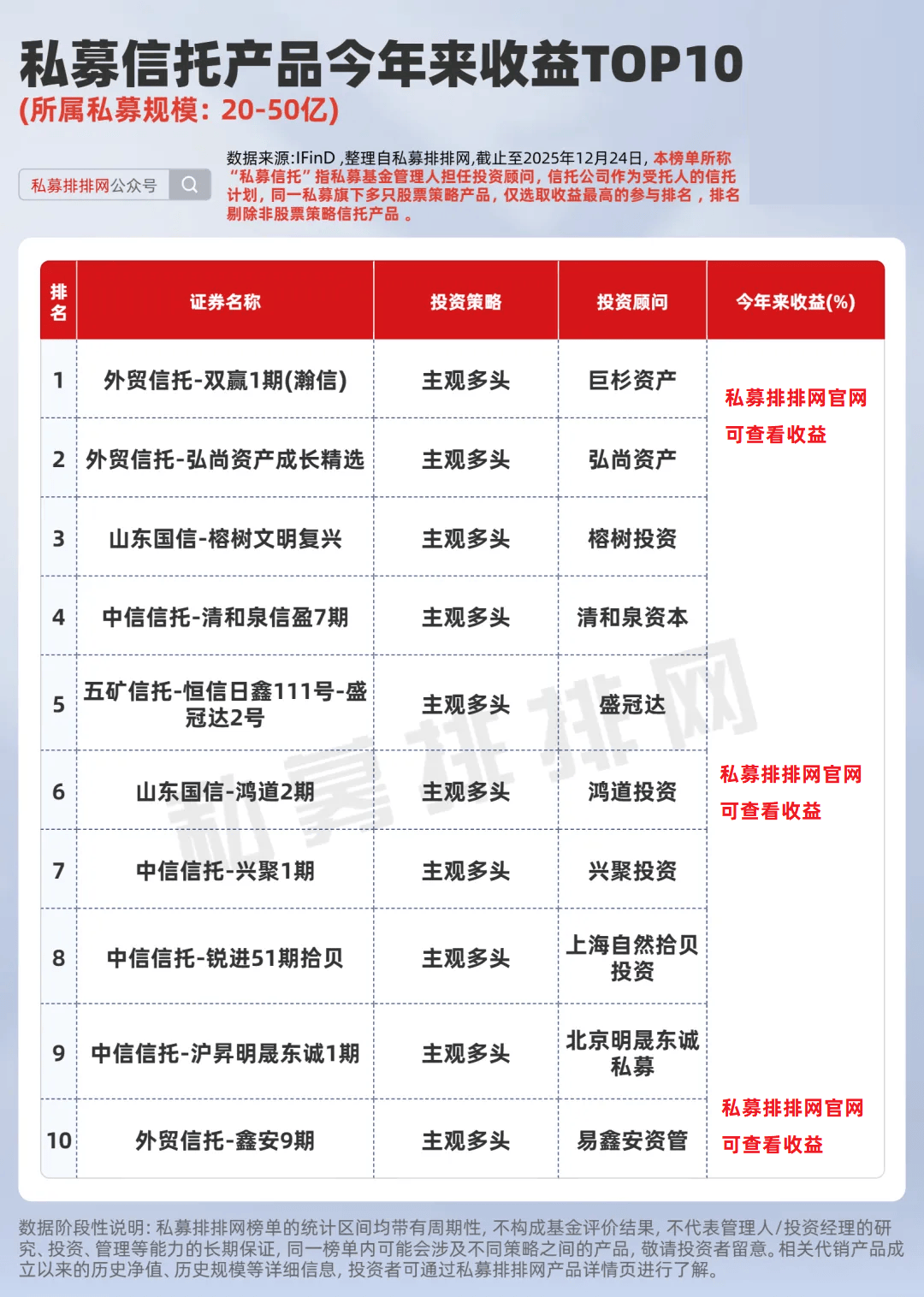 私募管理人担任信托产品投资顾问,不仅是业务拓展的机遇,更是整体投资研究能力、市场分析能力和资产配置能力的重要体现。为此,本文按不同规模私募,分别梳理出今年来业绩前十的股票策略信托产品,供投资者参考。(同一私募管理的相同策略,仅选取收益最高的产品参与排名)