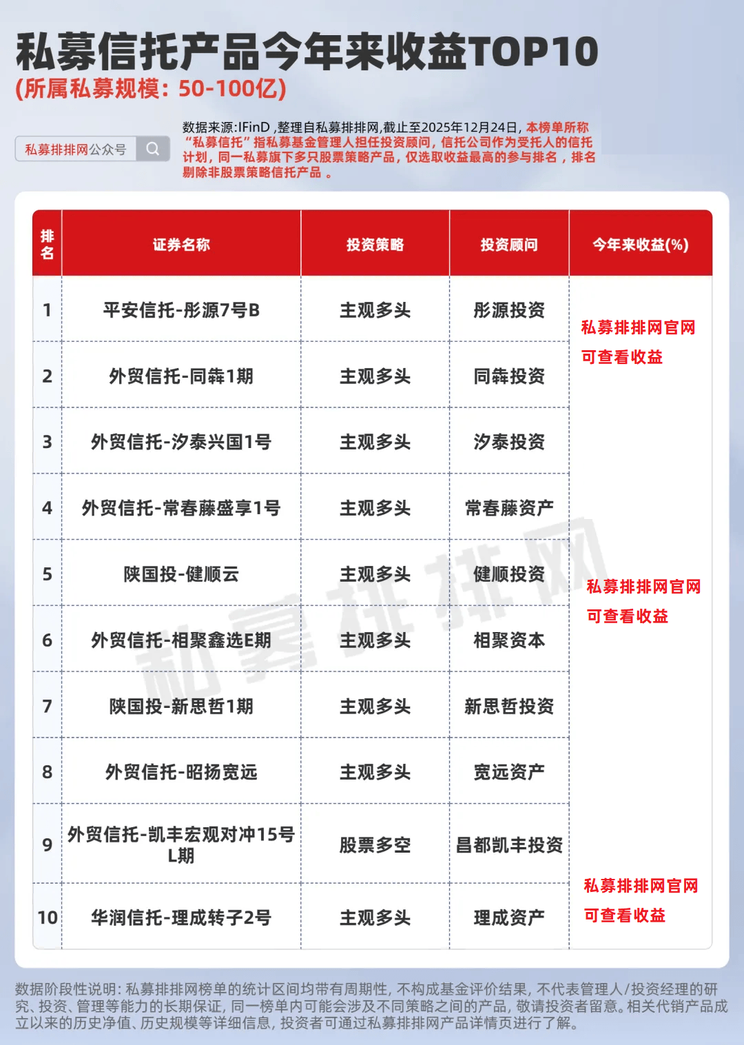 IFinD数据显示,截至12月24日,50-100亿私募管理有业绩显示的股票策略信托产品有94只,今年来收益均值为22.60%。今年来收益位居前三的股票策略信托产品分别来自:彤源投资、同犇投资、汐泰投资。
