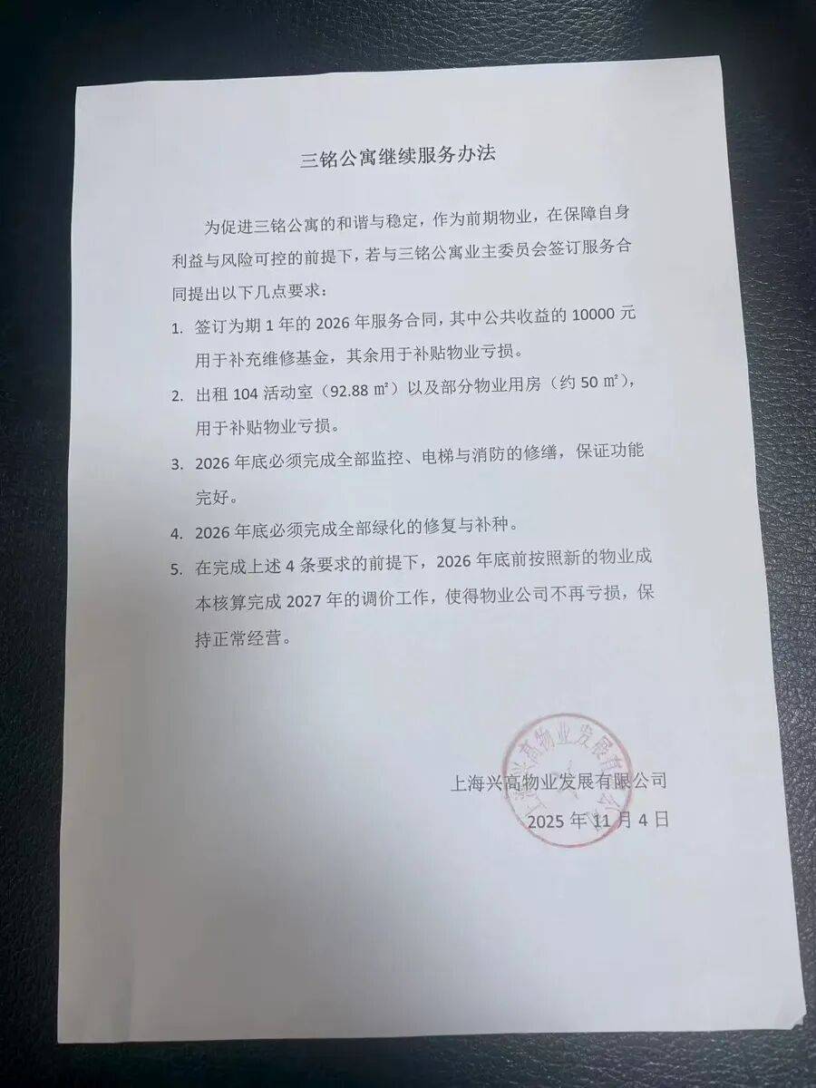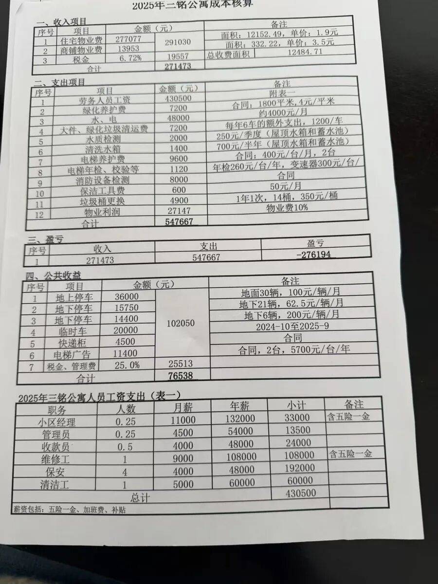 在小区业委会的不断督促下,物业公司出具了一份2025年成本核算表。与此前公示的“零收益”账目不同,表格中,电梯广告费、快递柜场地费等各项类目均有进账,扣除税费及管理成本后,合计收入7万余元。但账目同步显示,小区当年物业费收入27万余元,但各项支出达54万余元。2025年年底,兴高物业以经营亏损为由向业委会提出了一份“继续服务办法”,要求将2026年小区所获公共收益用于补贴物业亏损,仅保留1万元补充维修基金。在此基础上,业委会还须自行完成全部监控、电梯与消防设施的修缮,及全部绿化的修复与补种,小区物业费也将面临调价。