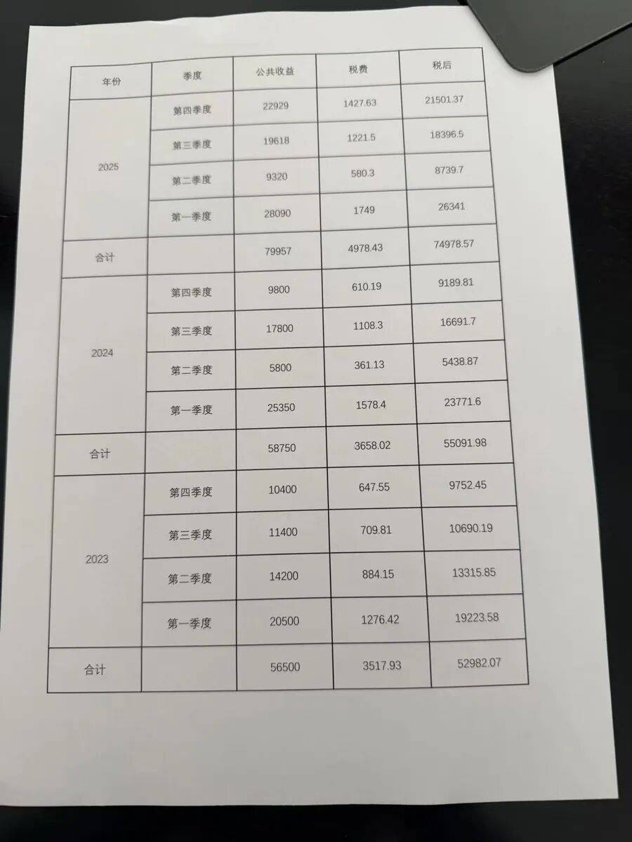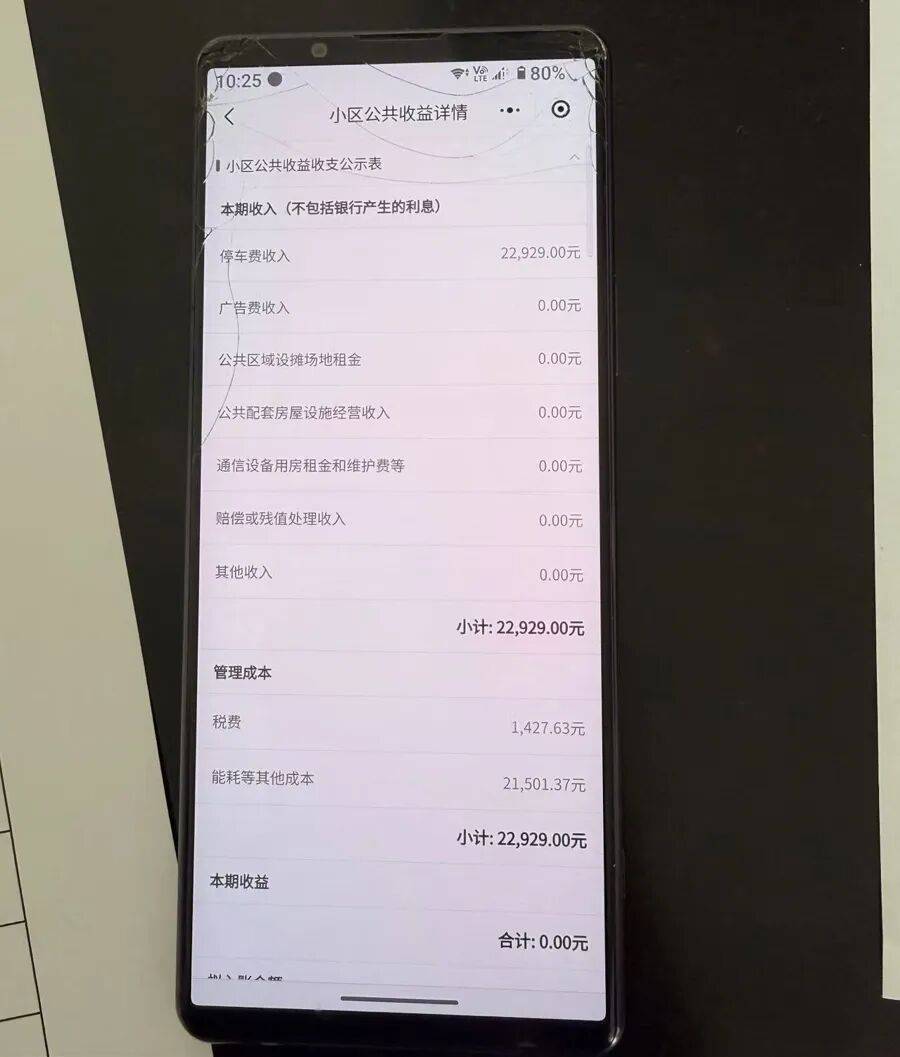 “零收益”的结果引发了业主们的集体质疑。林先生介绍,尽管小区仅有一栋楼,但能够产生公共收益的资产并不少:“地面、地下大约各有30个车位,每个月都会产生租金,还有临时进出小区的车辆,也会按照每小时4元的标准收费。楼栋里有电梯,广告几乎没停过,一楼大堂还放着丰巢快递柜,必然也会产生场地租金。各项收入叠加,绝不可能是零。”百般怀疑之下,林先生通过小程序,仔细查询了历年的公共收益明细,发现“停车费”一栏上,每个季度都确有1万元至2万元不等的收益,但巧合的是,扣除税费及管理成本,每个季度都恰好“归零”,公共收益账户内再无结余。